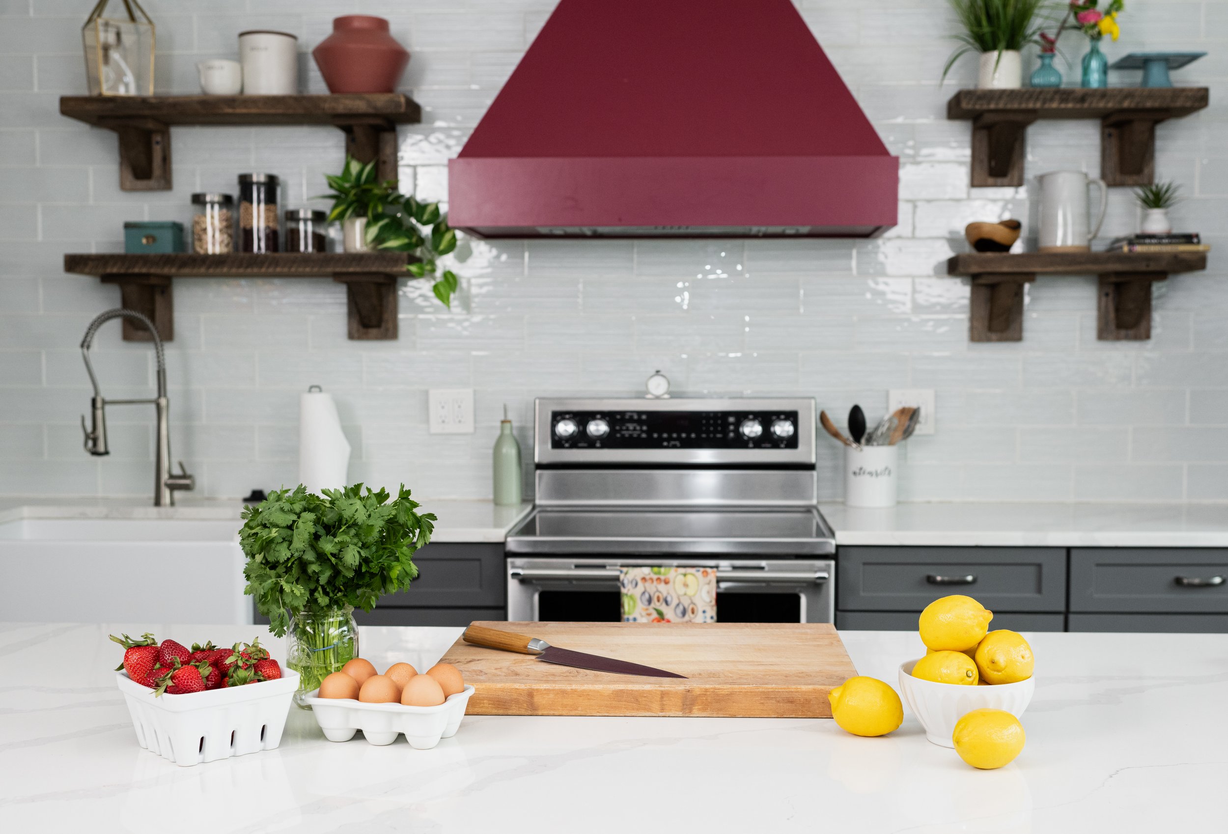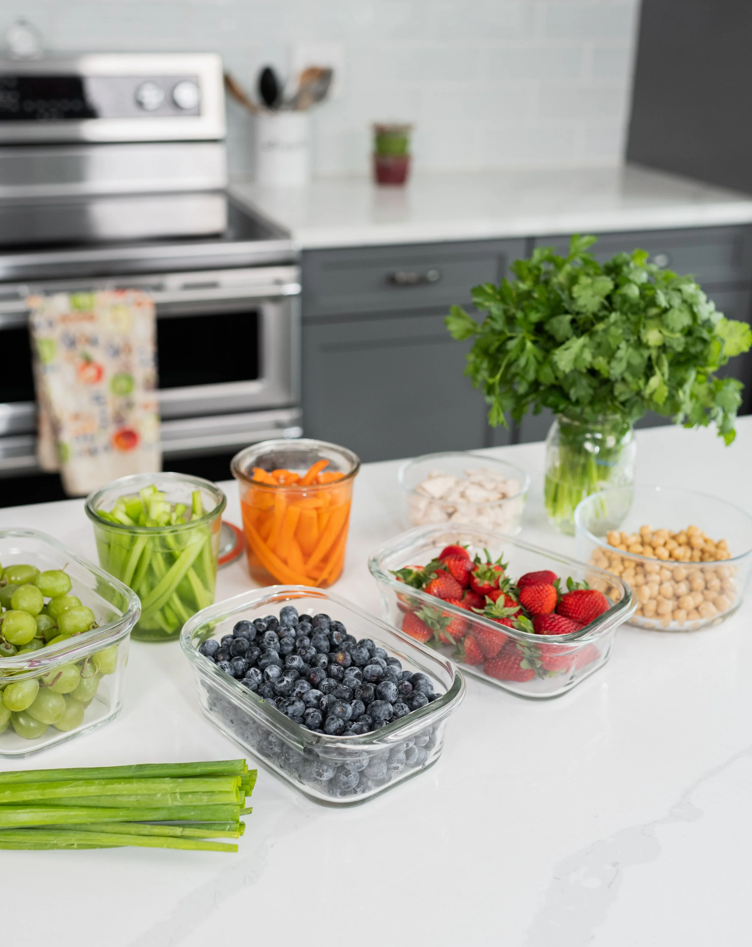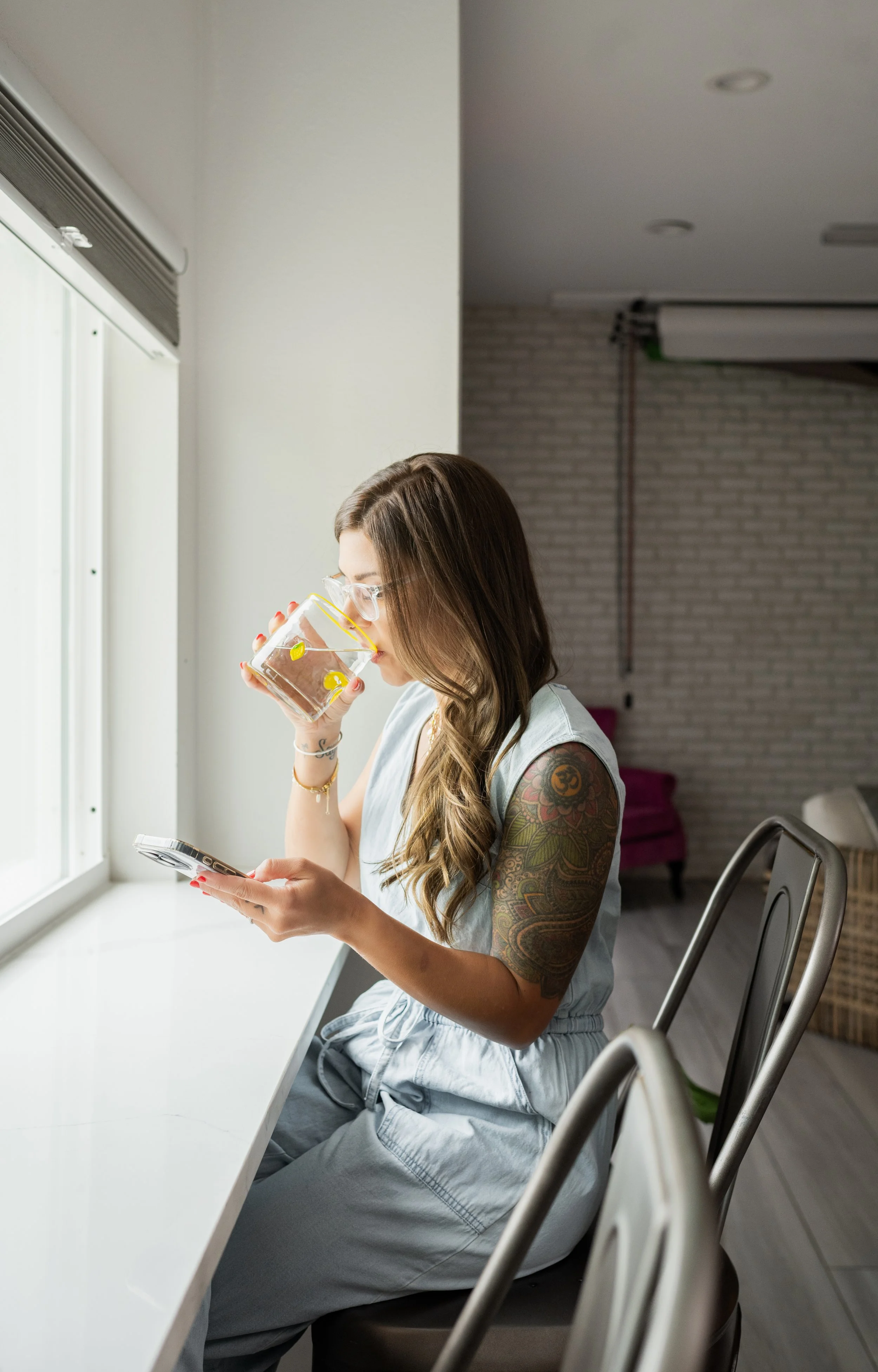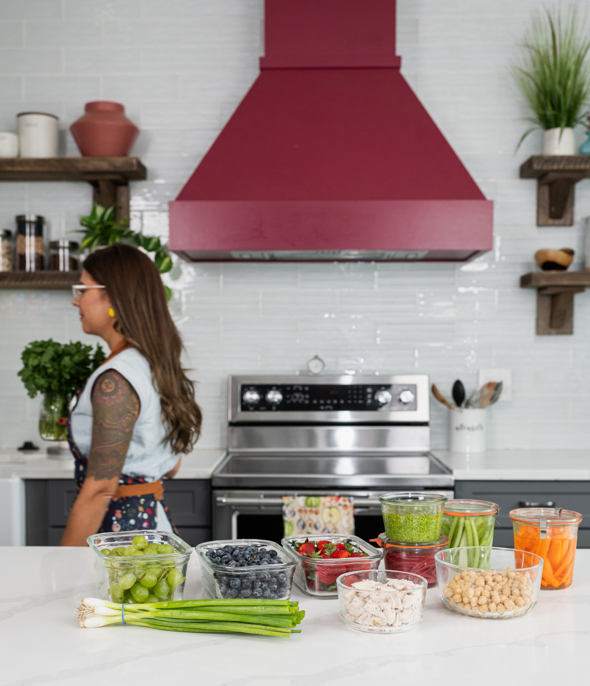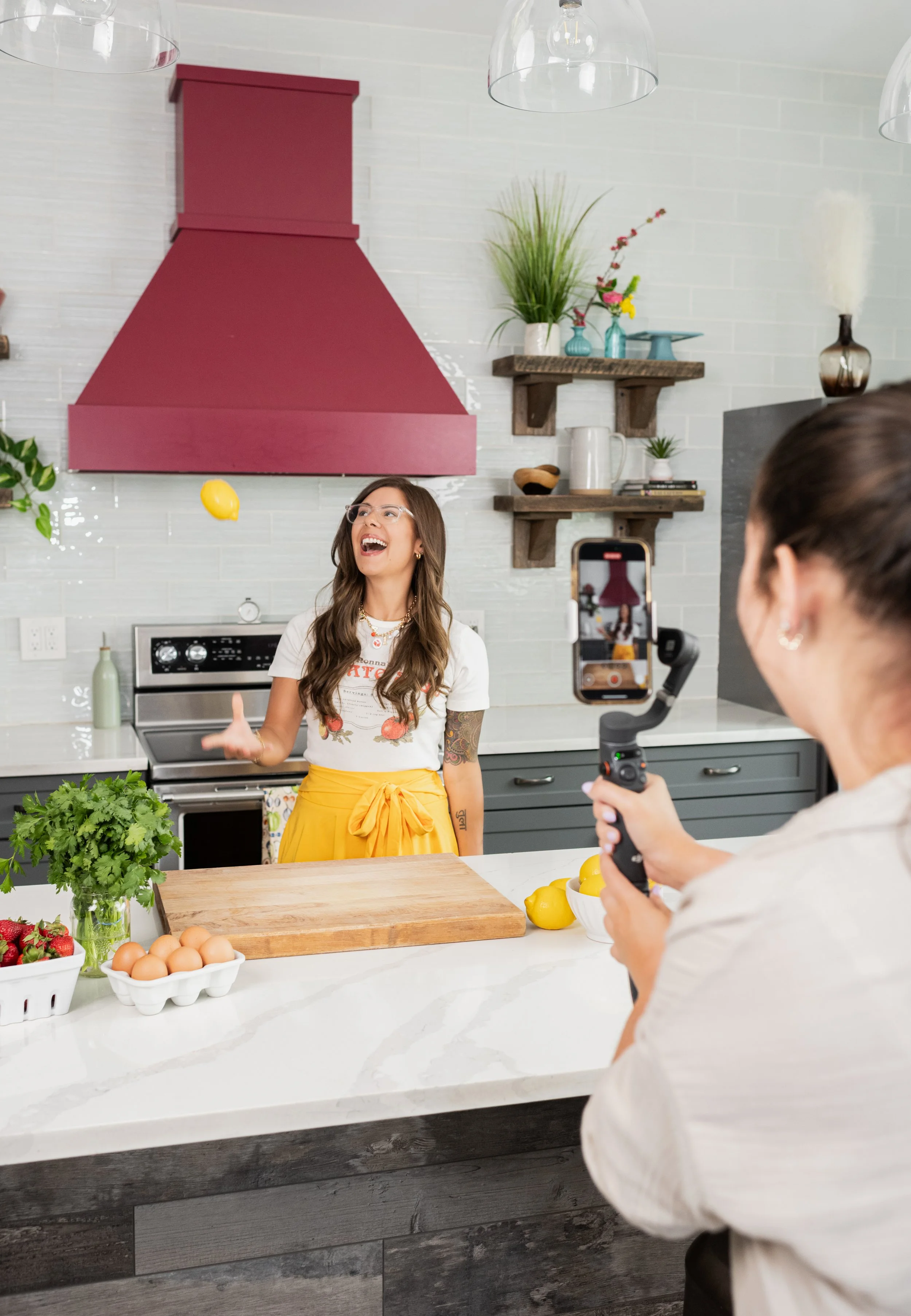Kris hadn’t done a brand shoot in a few years, so it was time for an update. We shot in this beautiful kitchen/studio that I found on Peerspace. It was the perfect backdrop for shots of her meal prepping, scrolling through her membership app, tossing food and more.