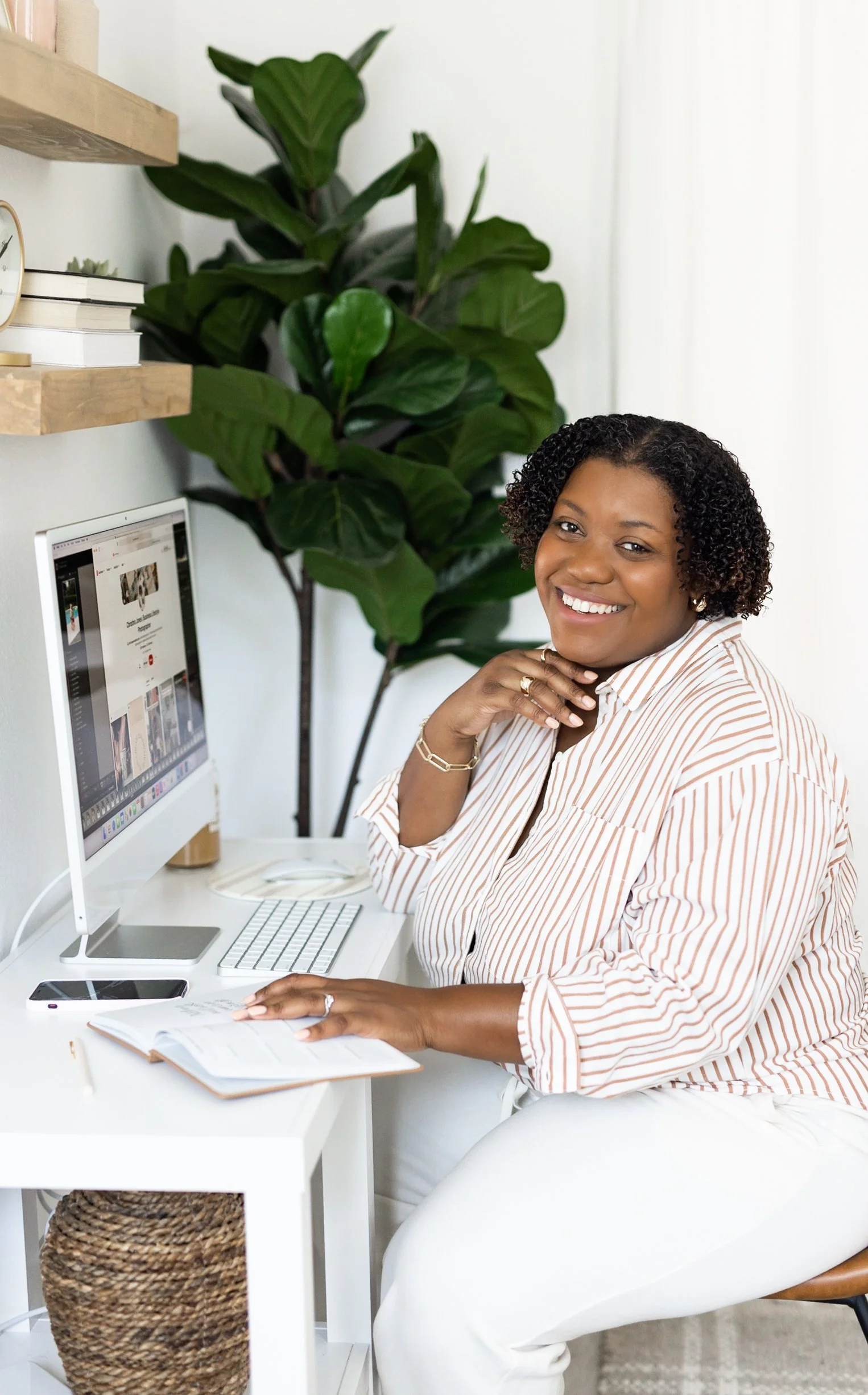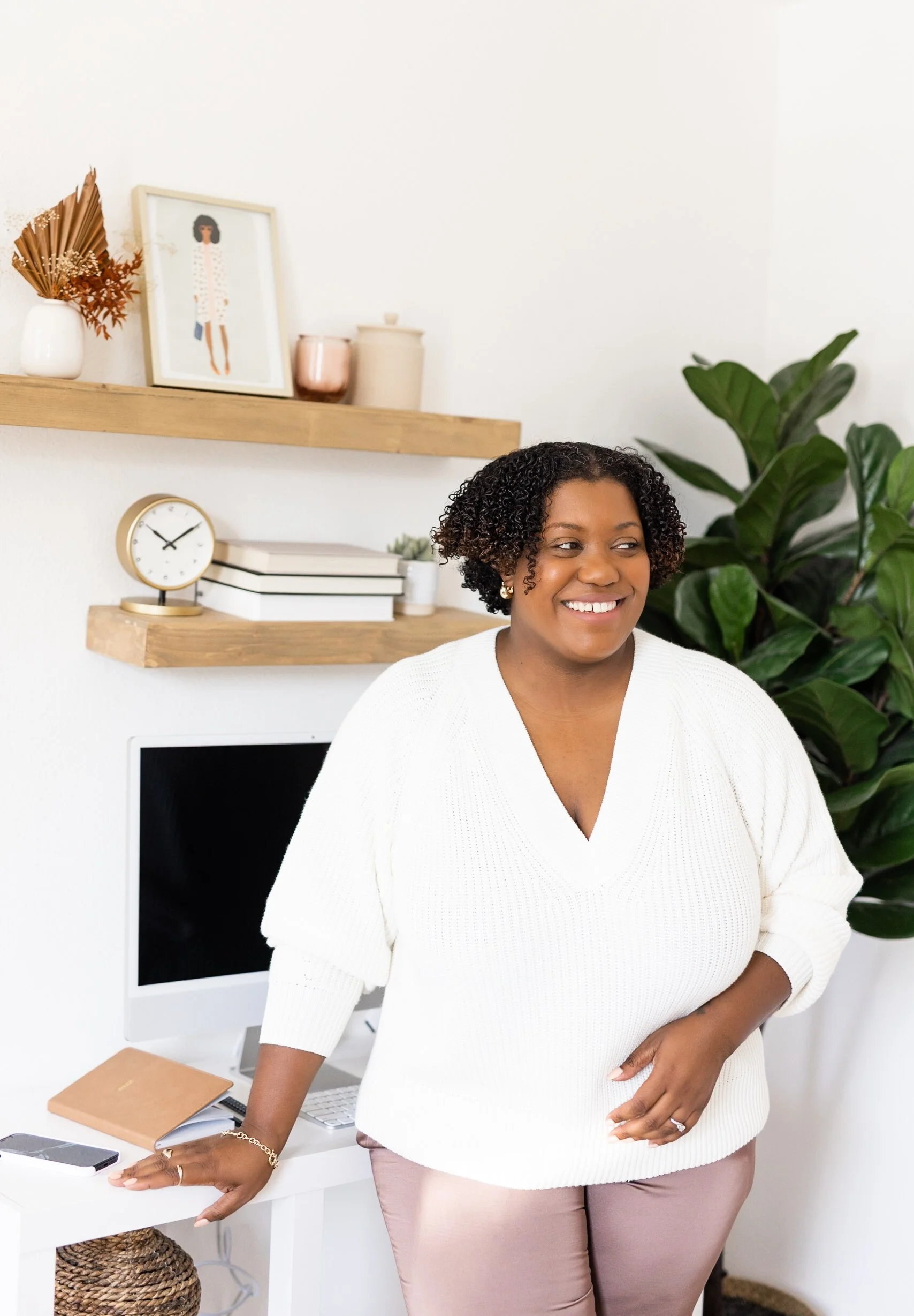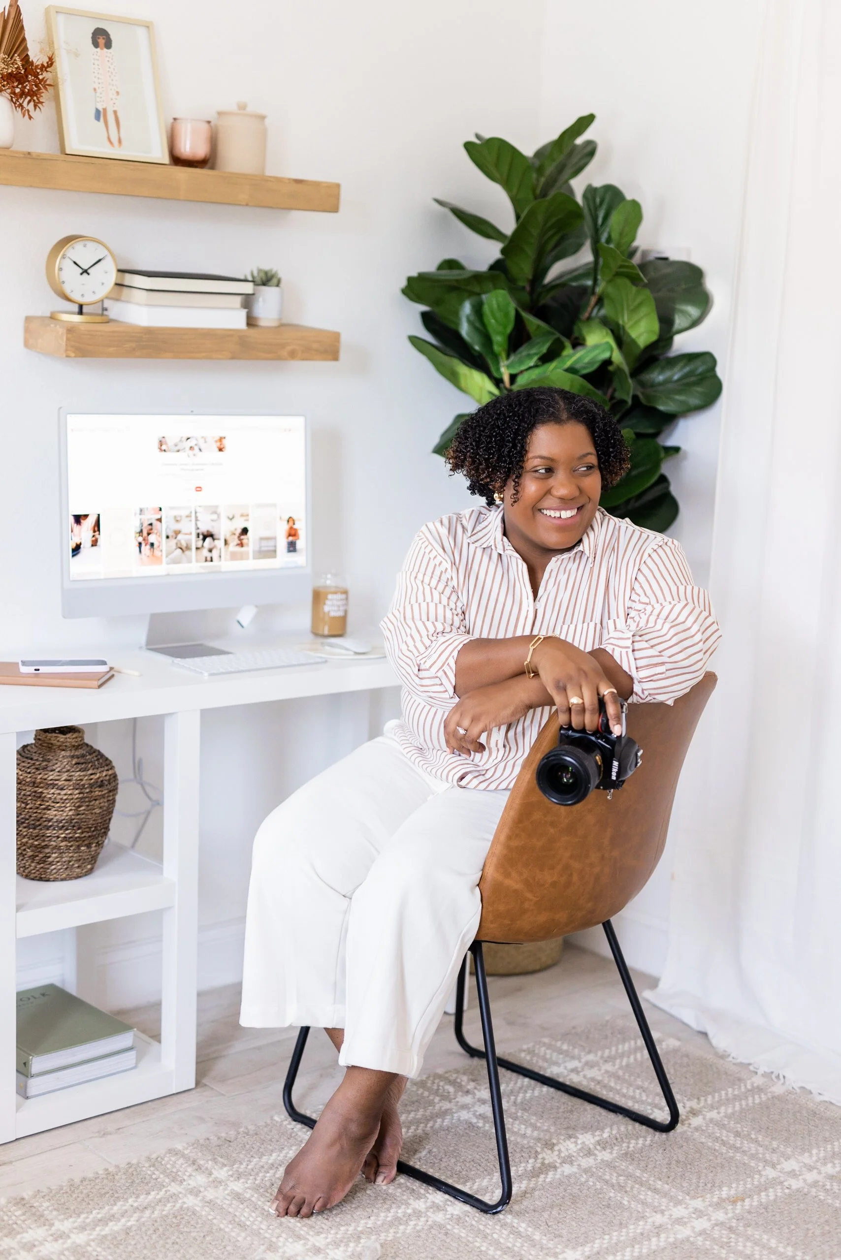 I decided to shoot in my studio, because I recently purchased a new desktop computer (I’m obsessed) and wanted to get some “working style” shots at my desk. Most of my client sessions are also at my studio, so I wanted to capture some images of me around the space to give future clients some inspiration as well. Also, I decorated the studio myself, so it feels like my brand! The most important thing about choosing a location for your brand photos is to choose a location that aligns with your brand personality.