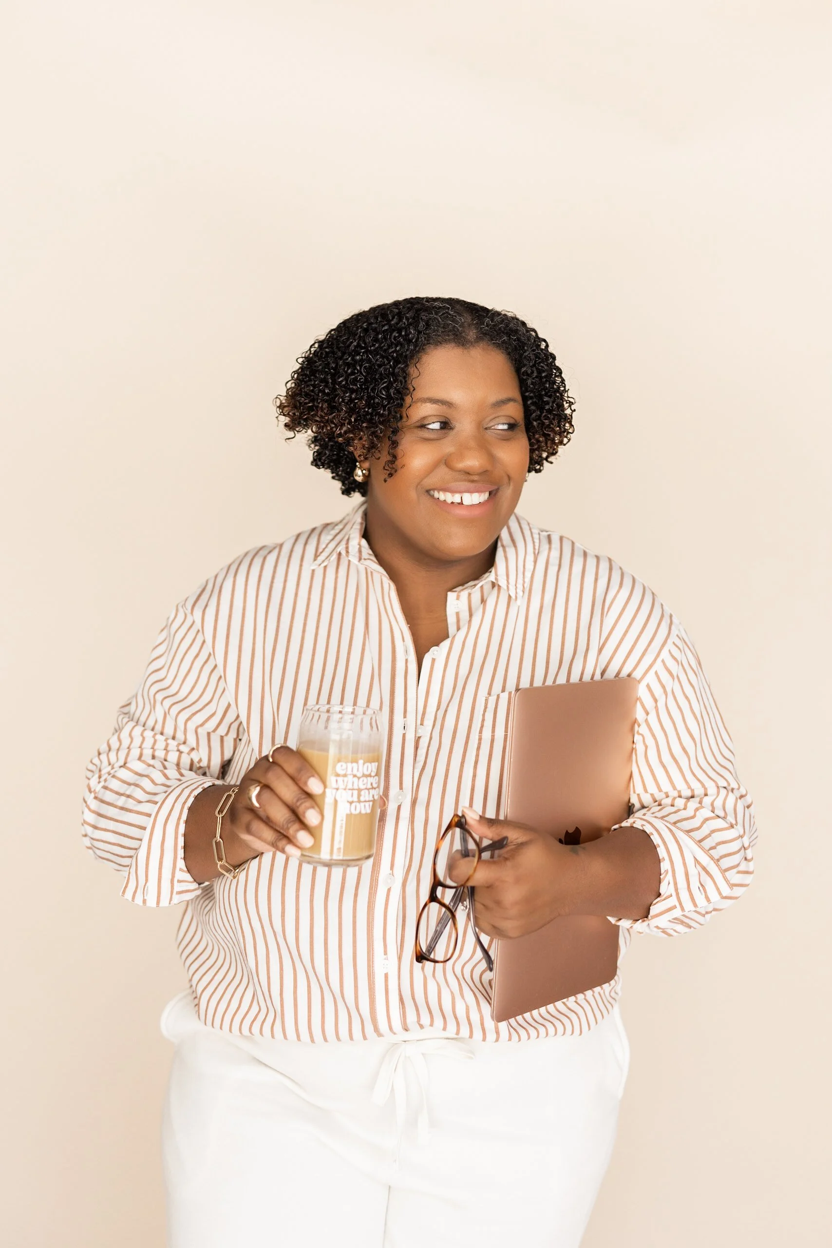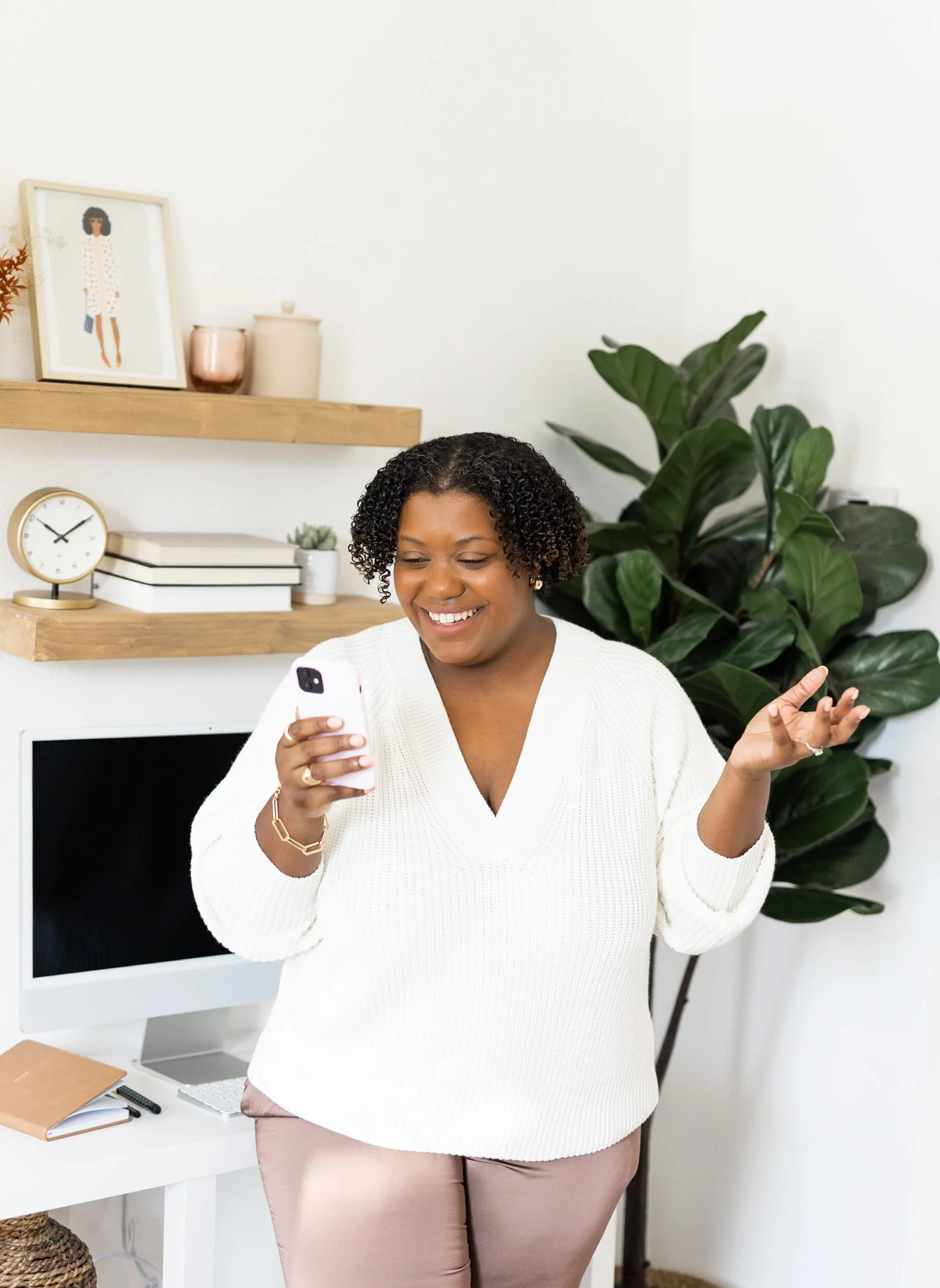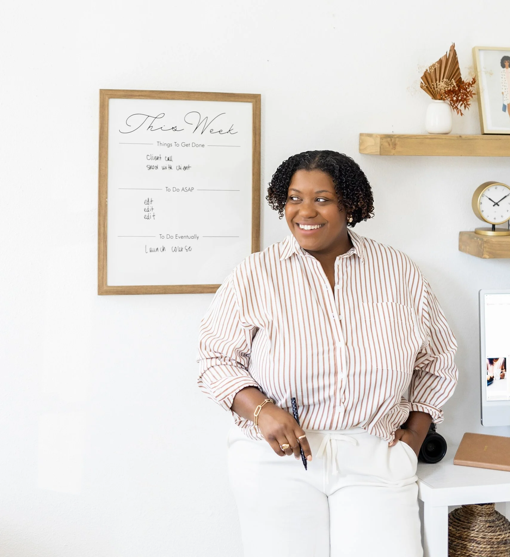 I decided to shoot in my studio, because I recently purchased a new desktop computer (I’m obsessed) and wanted to get some “working style” shots at my desk. Most of my client sessions are also at my studio, so I wanted to capture some images of me around the space to give future clients some inspiration as well. Also, I decorated the studio myself, so it feels like my brand! The most important thing about choosing a location for your brand photos is to choose a location that aligns with your brand personality.
