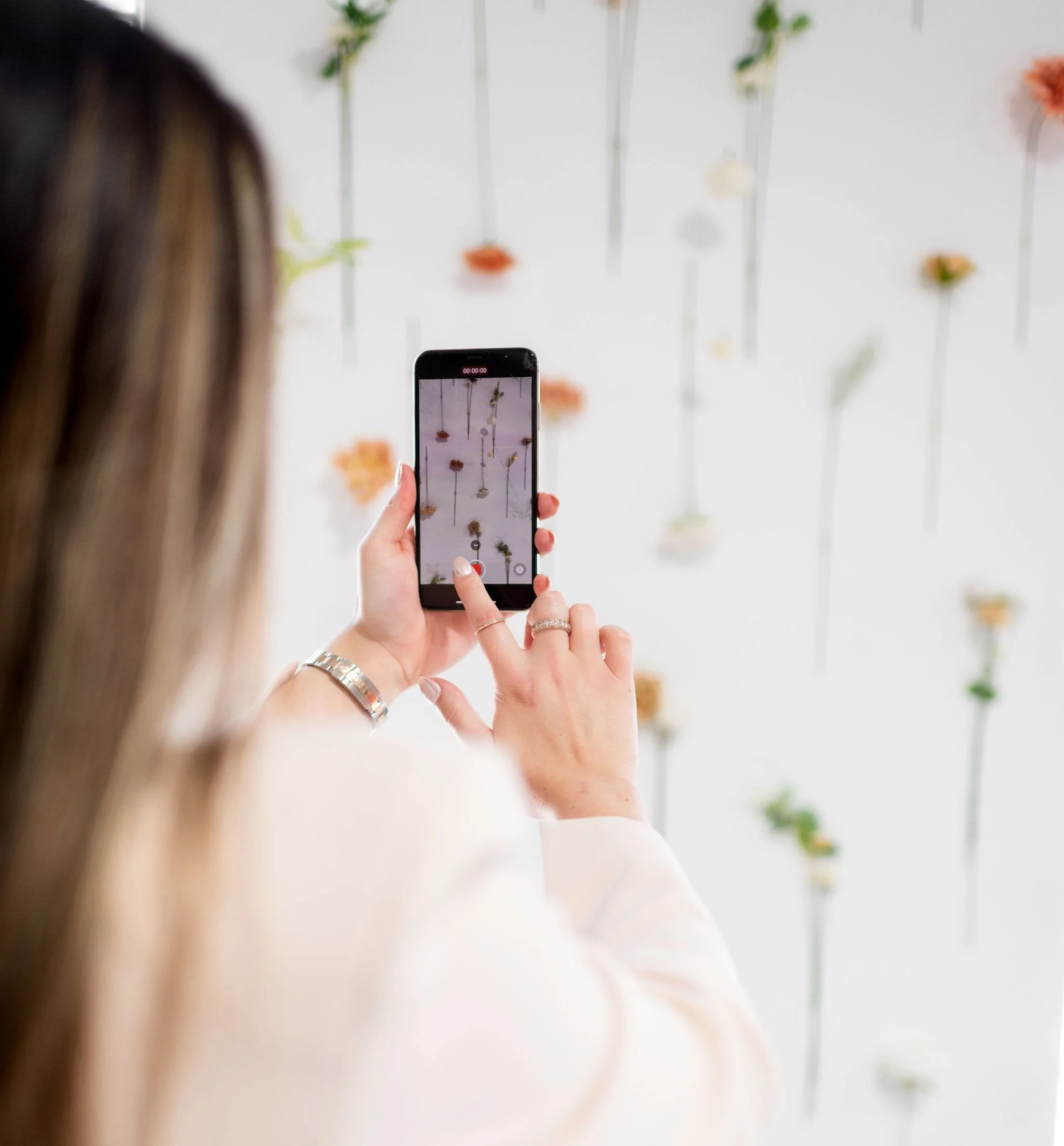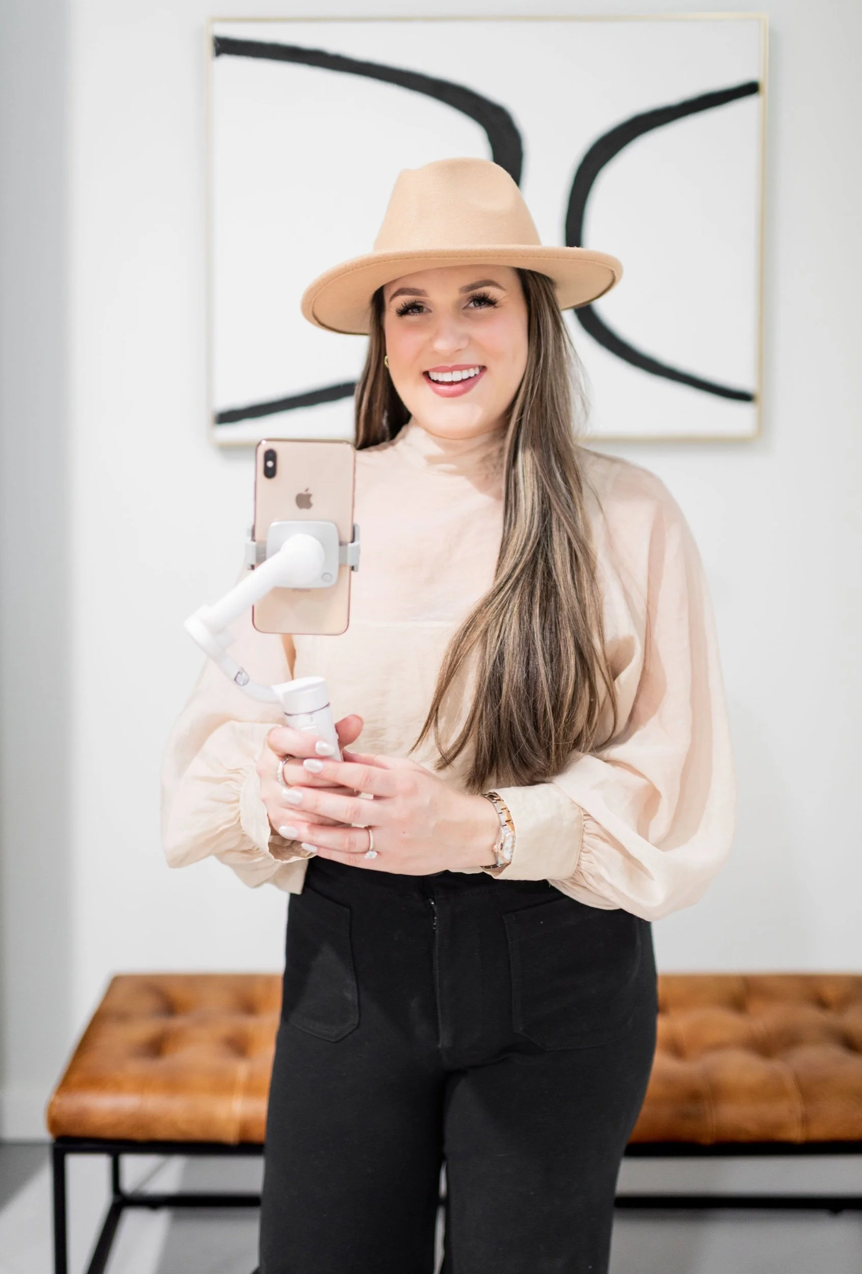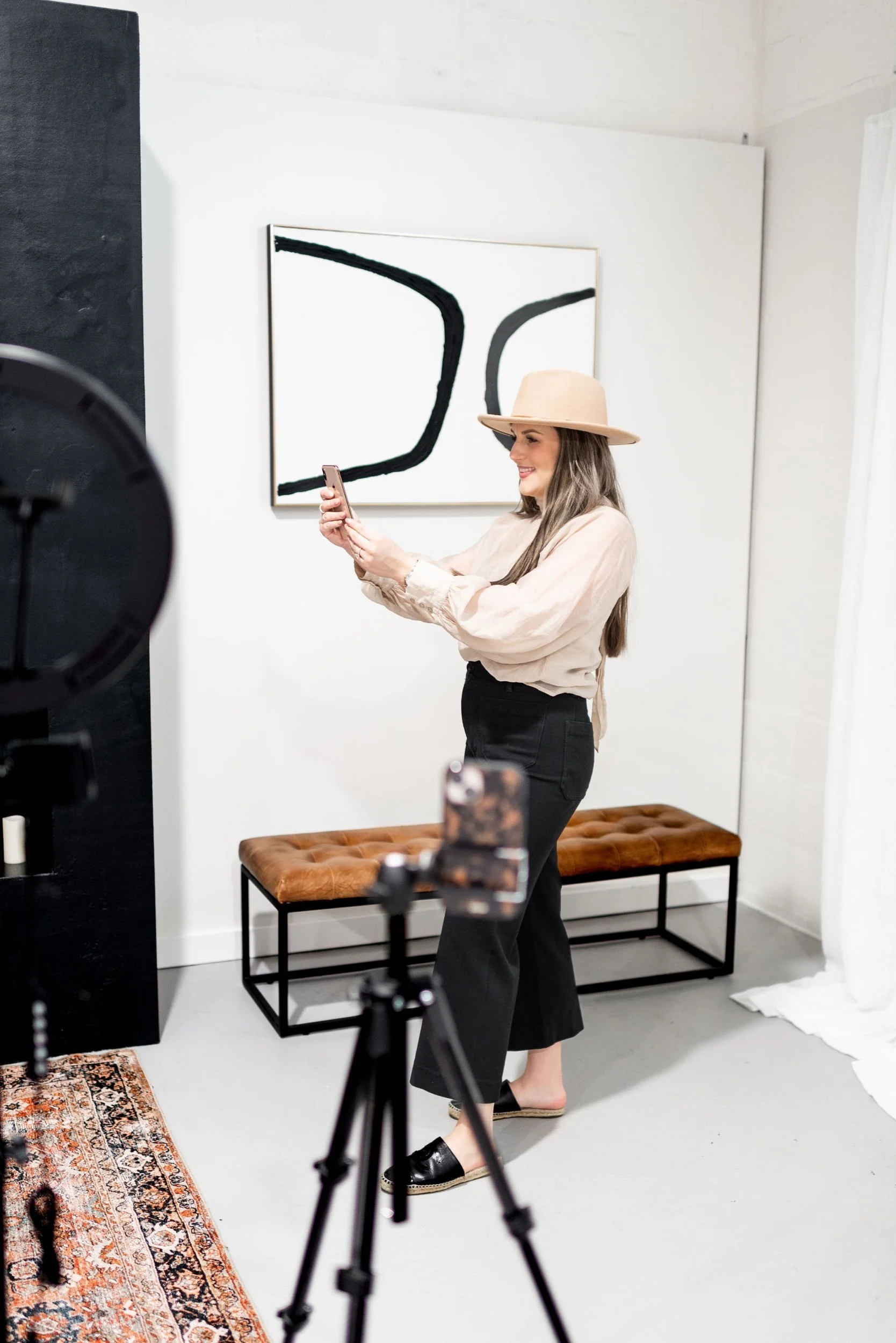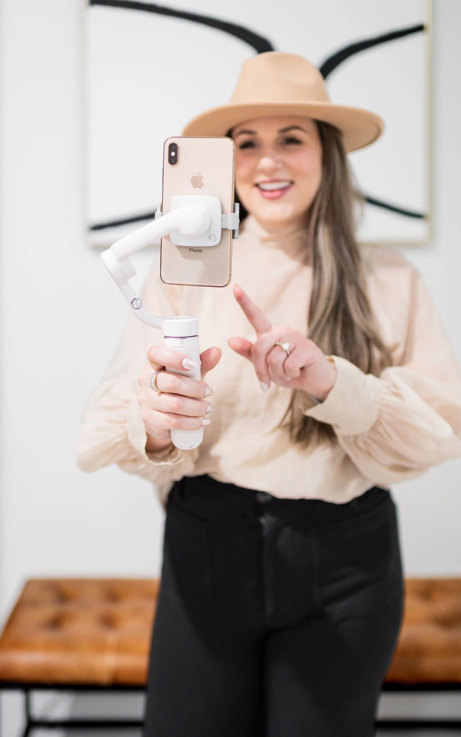 Working shots of her recording content with her phone, tripods and gimbal to show the busy life of a social media marketer