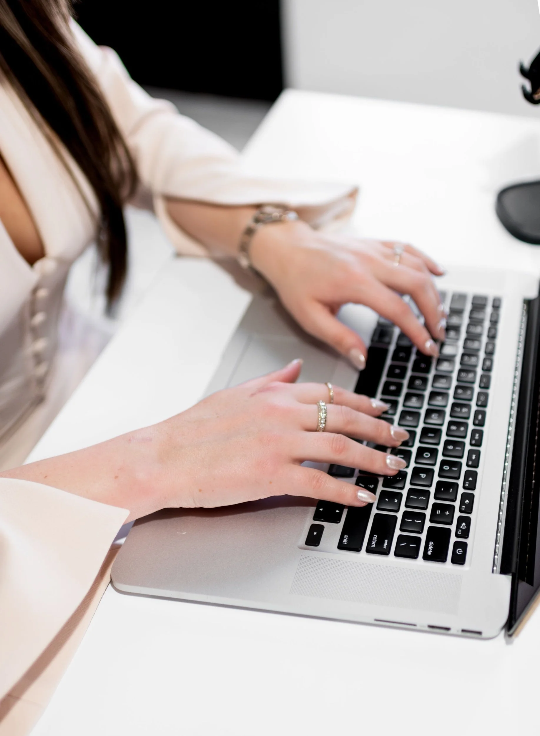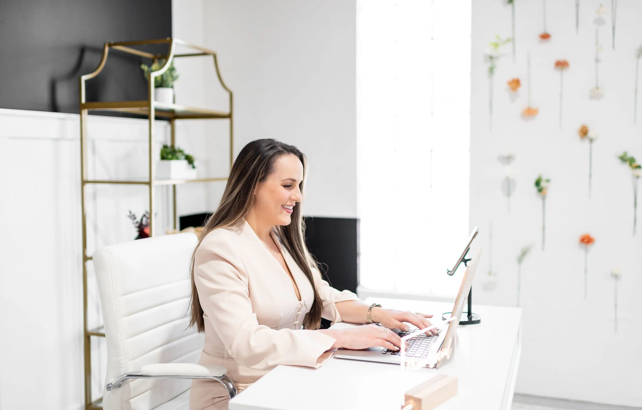 Authority shots of her working on the computer, talking with clients and reviewing work