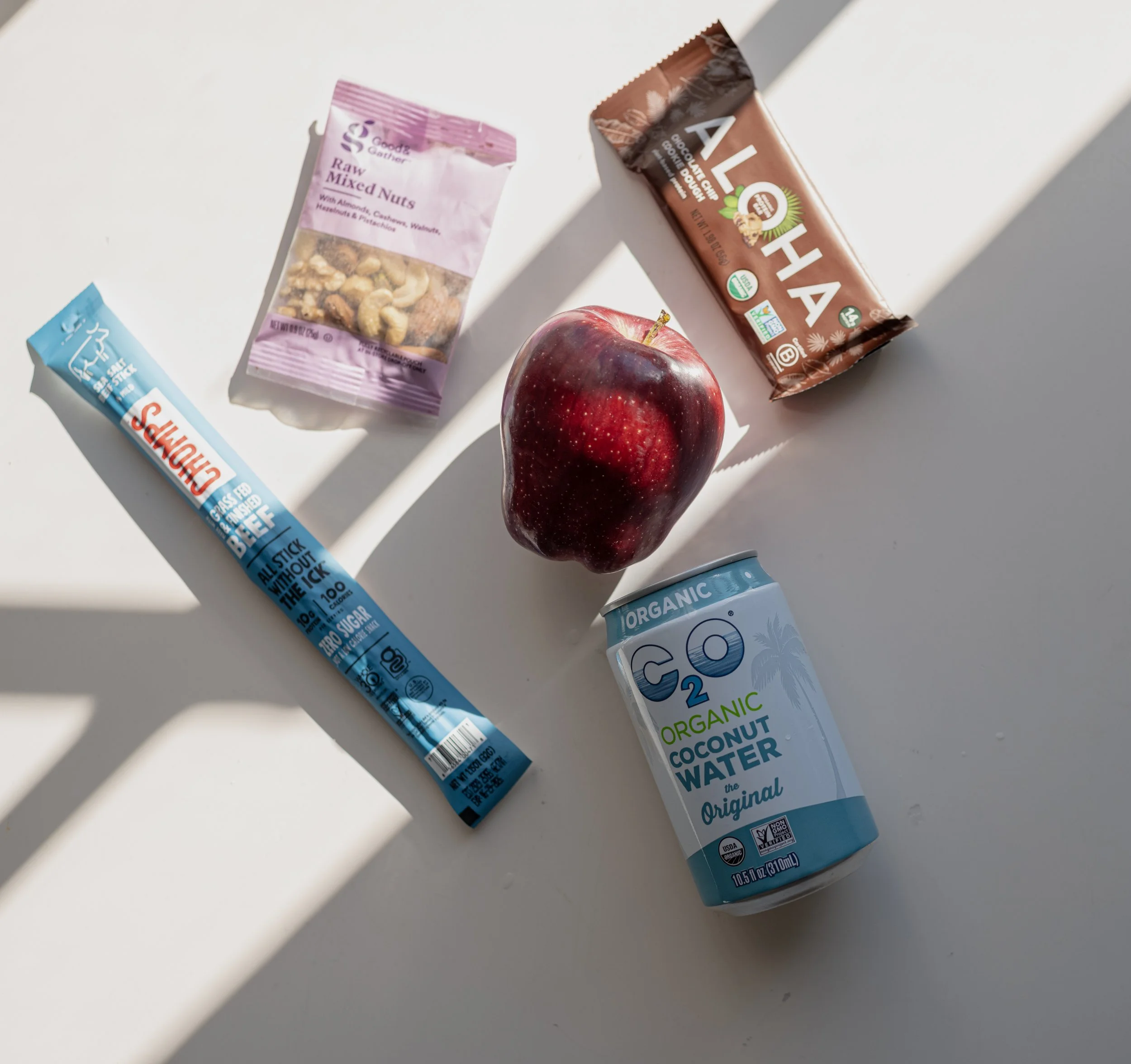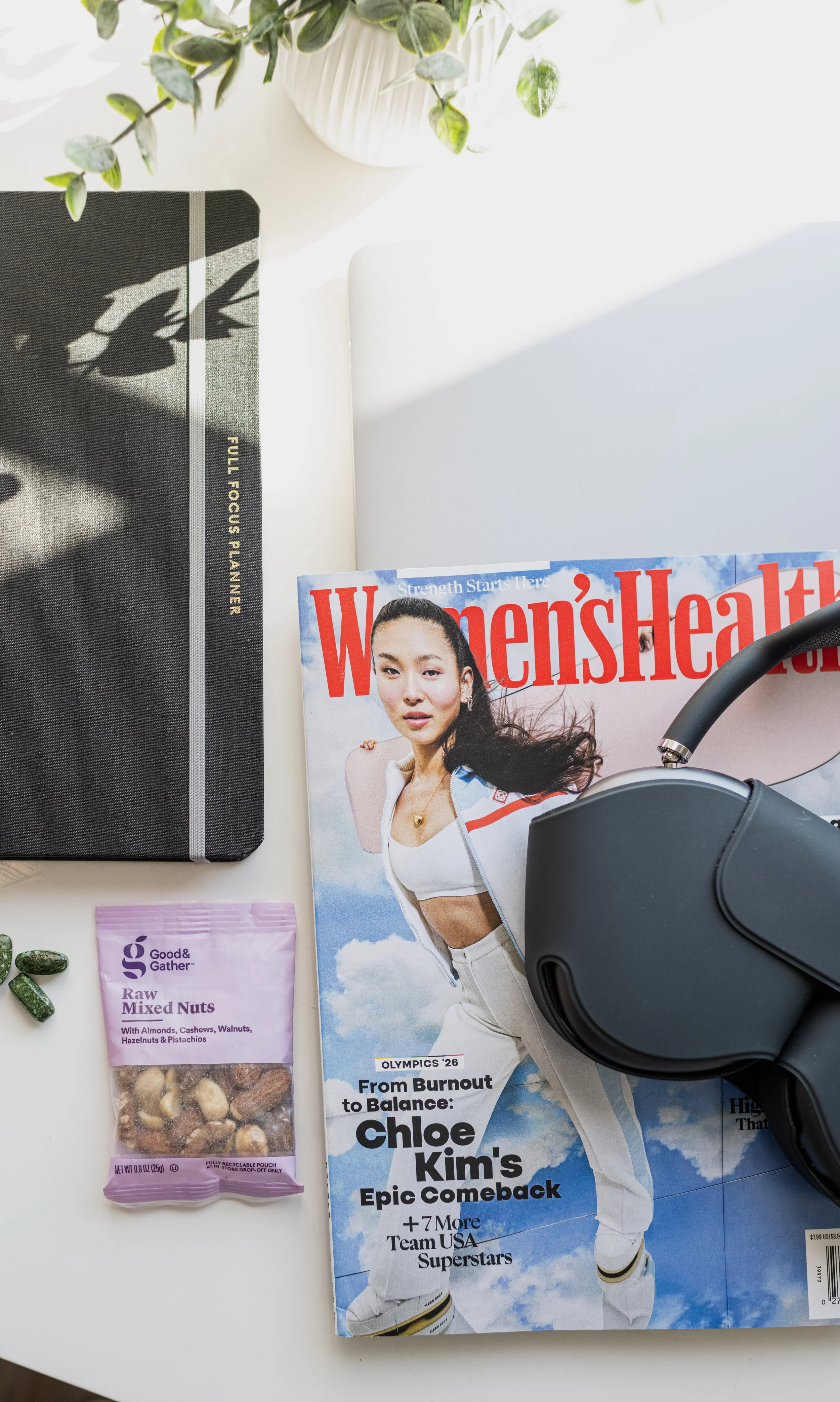 We captured brand photos with 5 outfit changes in a clean, minimal studio with a white background. We incorporated props that tell the story of her brand including healthy snacks, weights, and her podcast mic