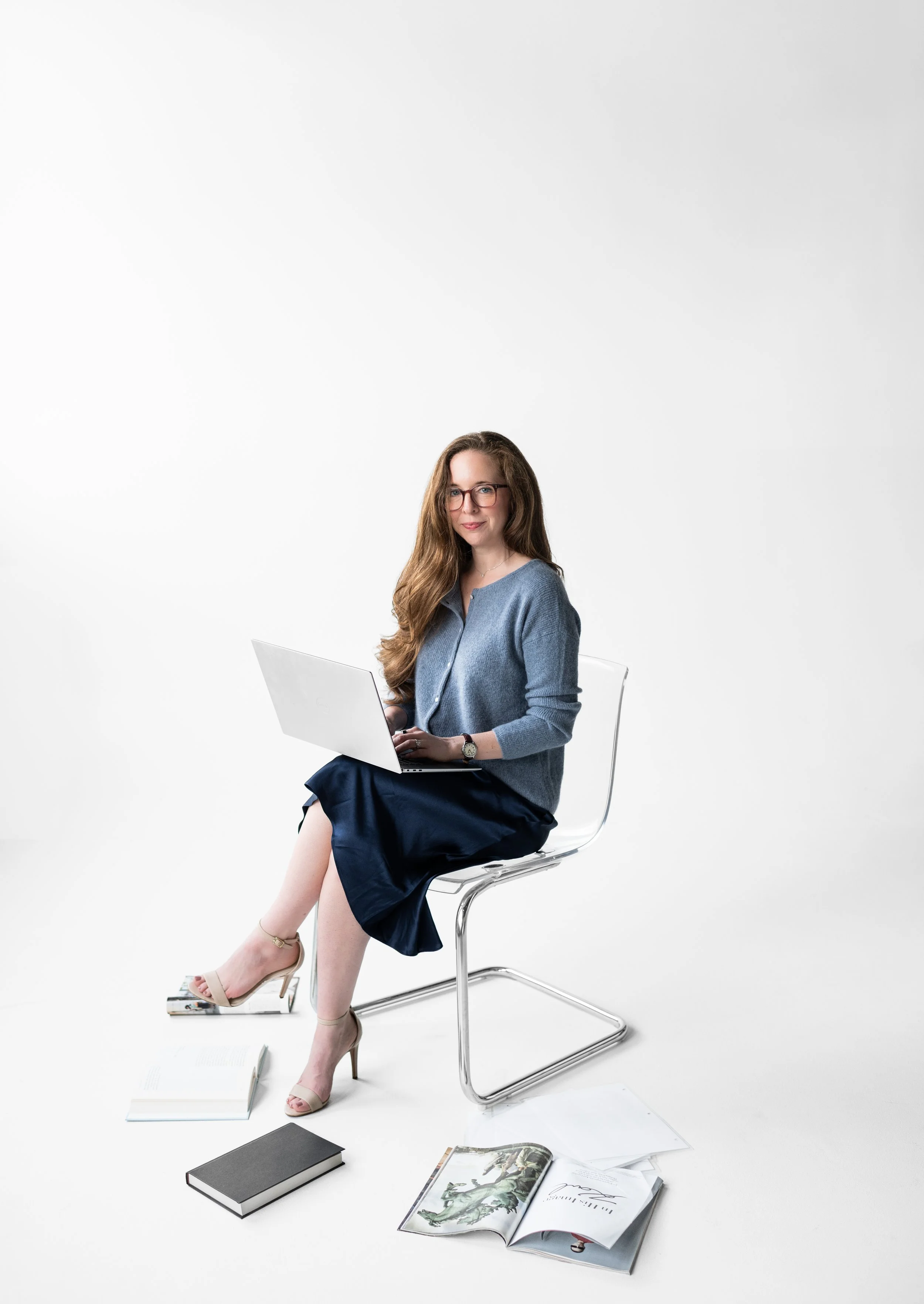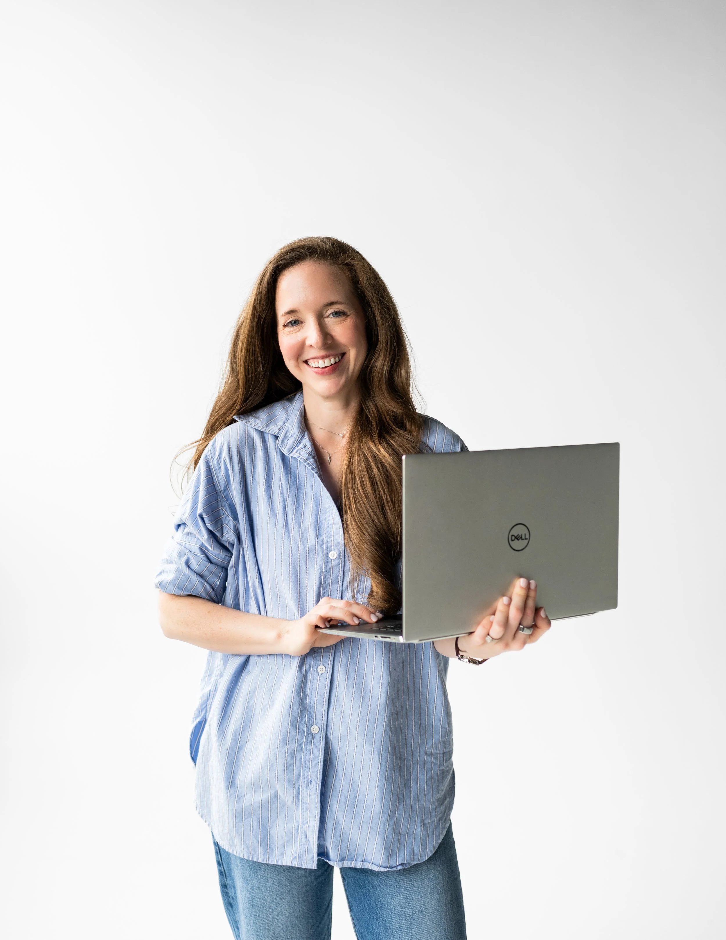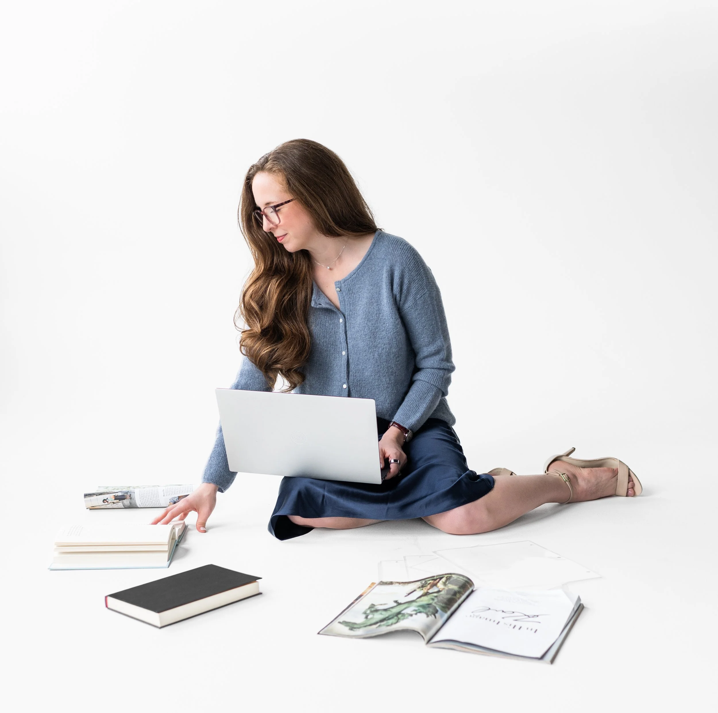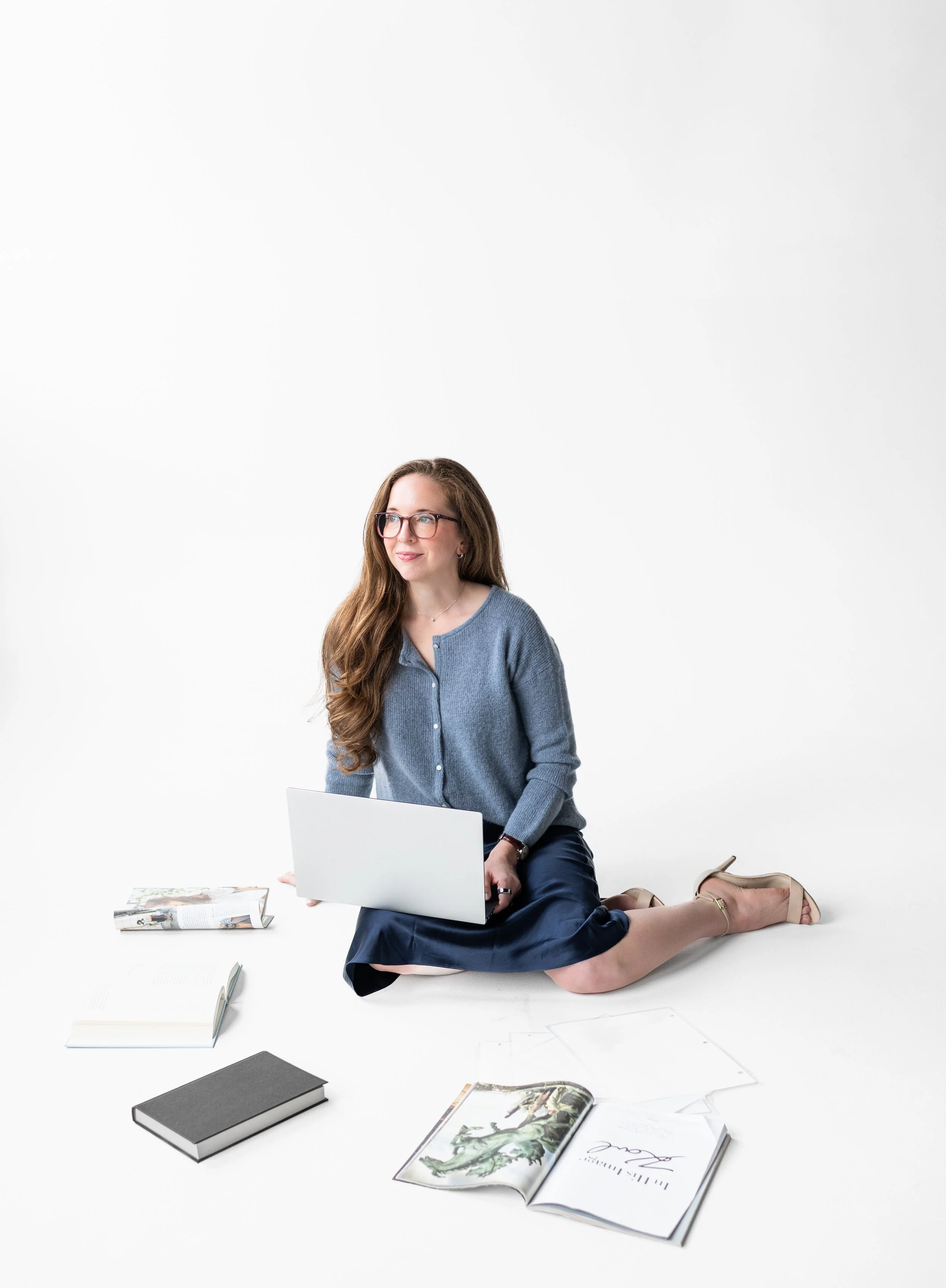 We captured brand photos with 3 outfit changes in a clean, minimal studio with a white background. We incorporated props that tell the story of her brand including laptop, notebook and iPad.