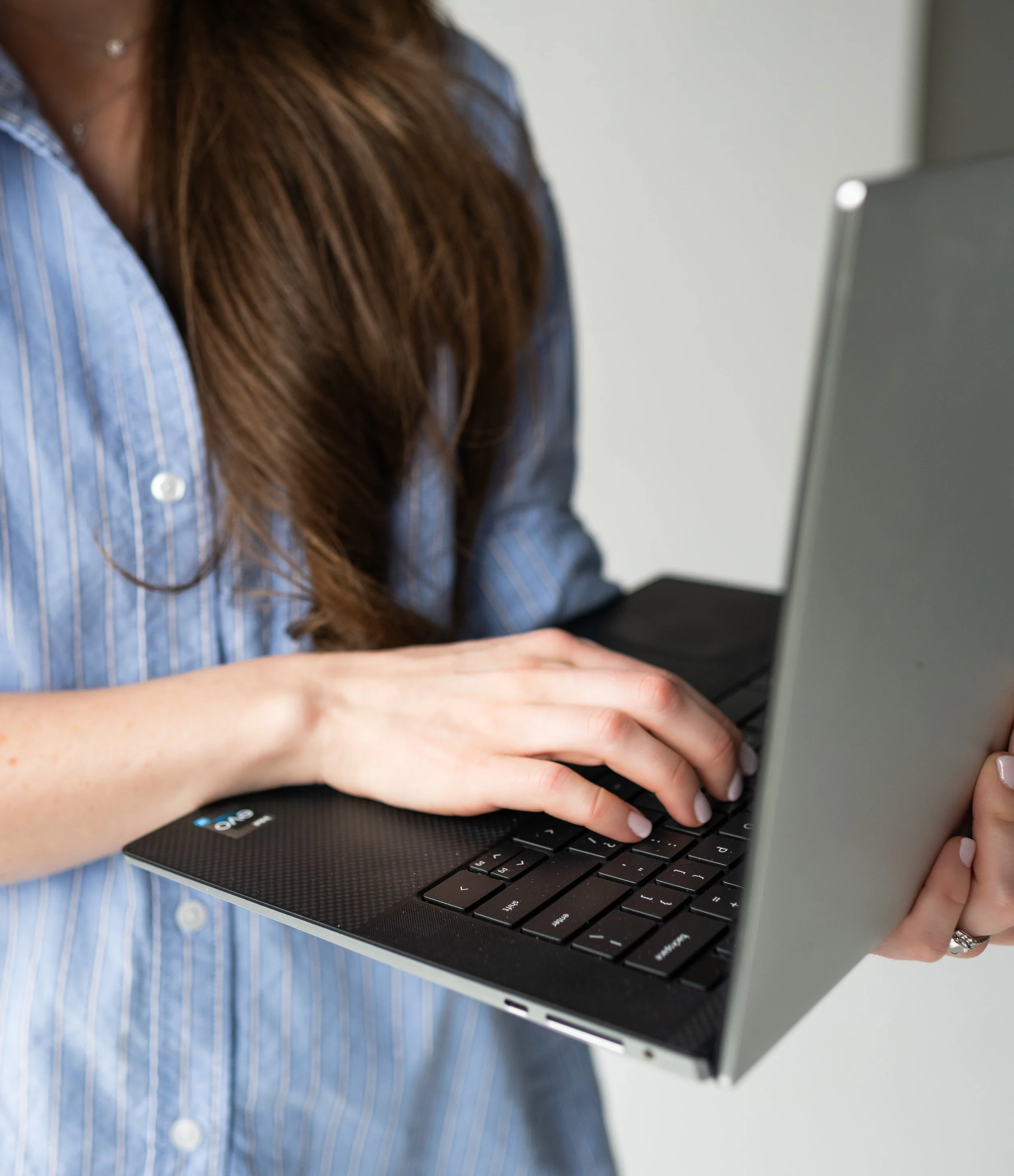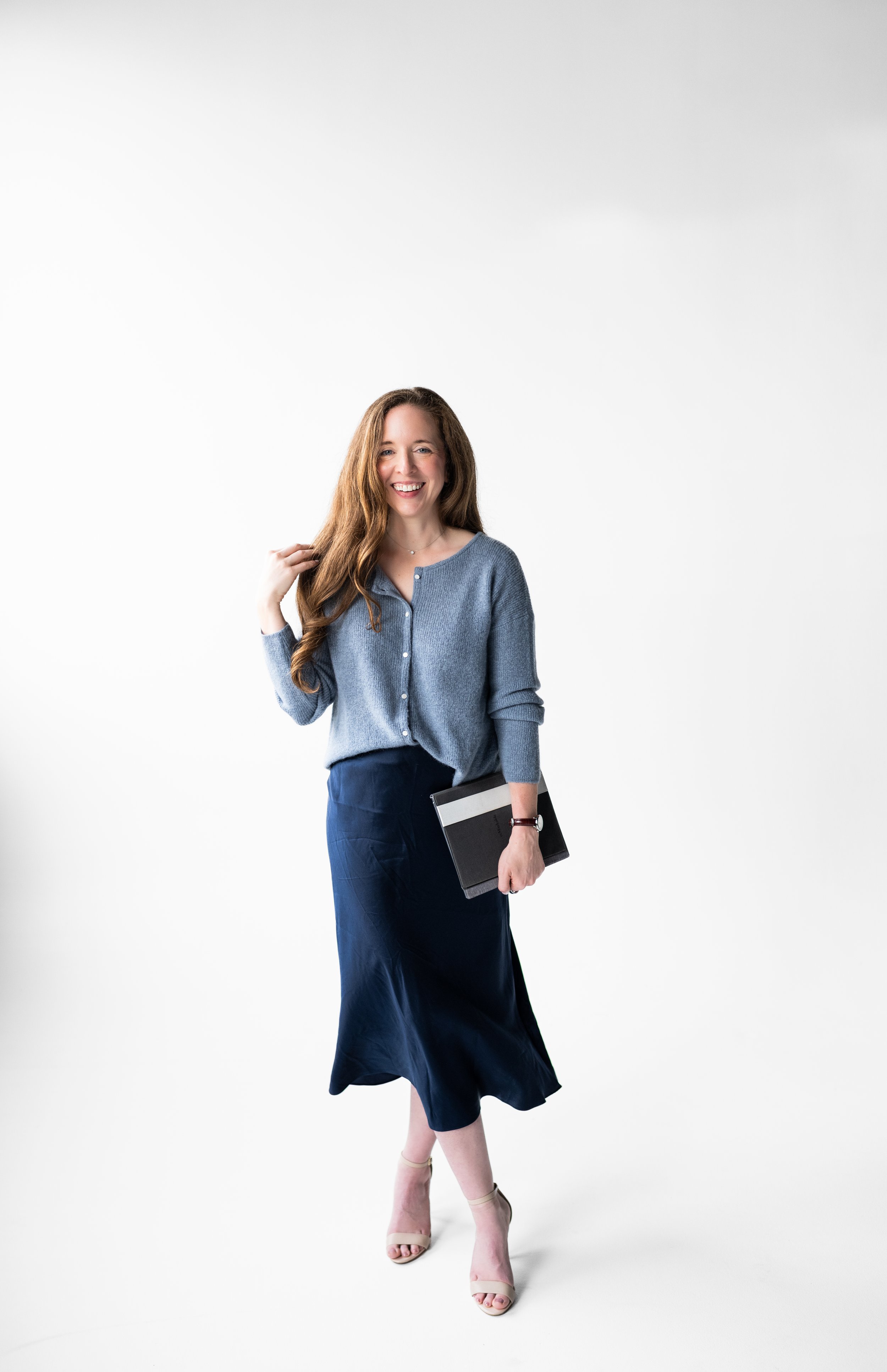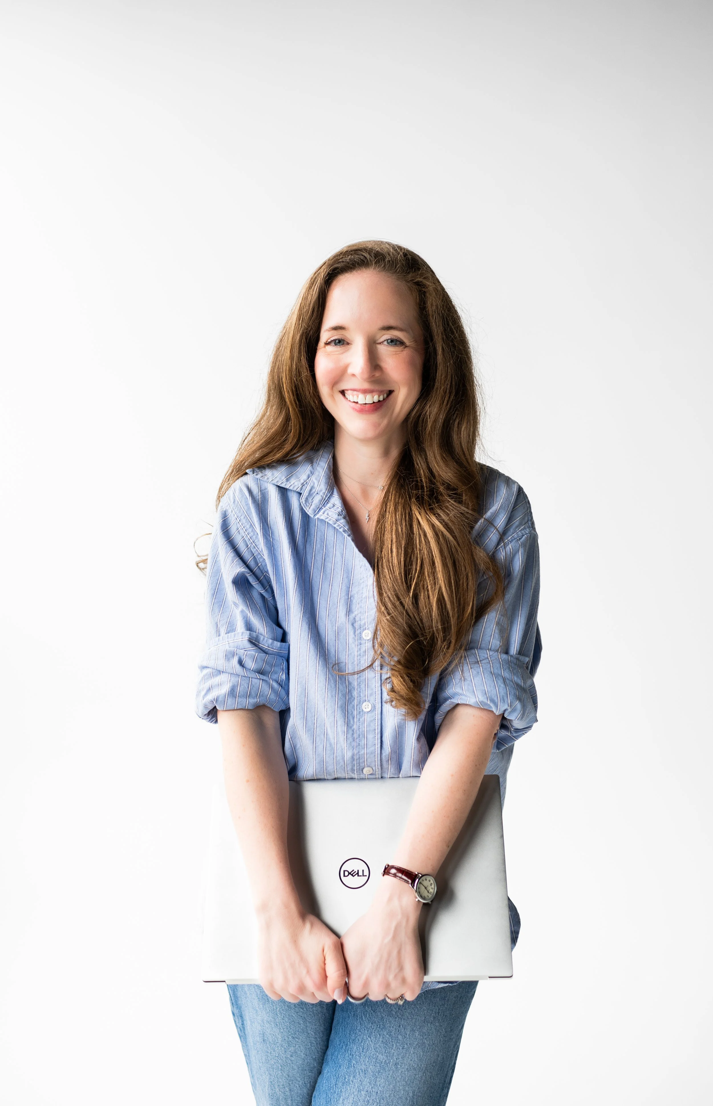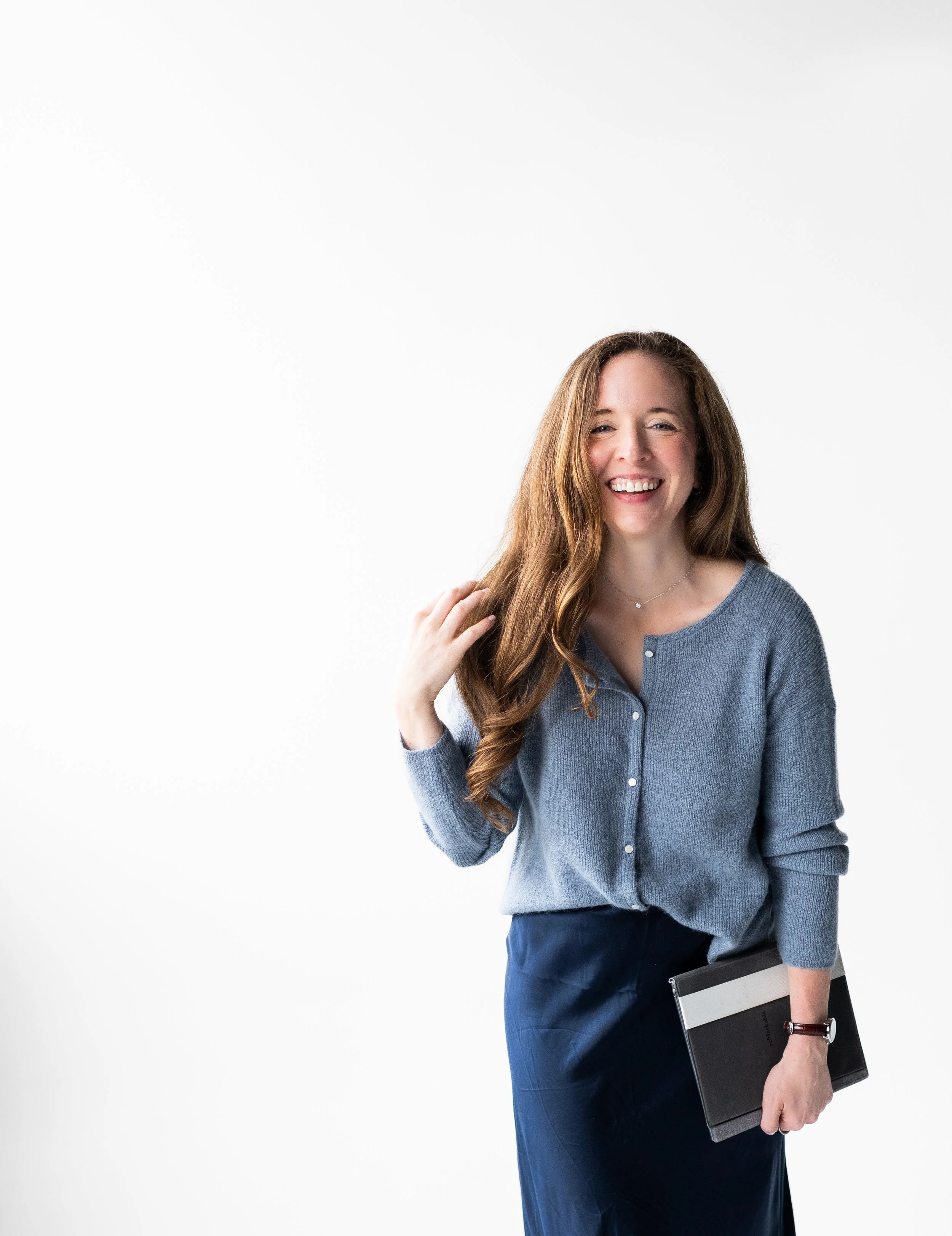 We captured brand photos with 3 outfit changes in a clean, minimal studio with a white background. We incorporated props that tell the story of her brand including laptop, notebook and iPad.