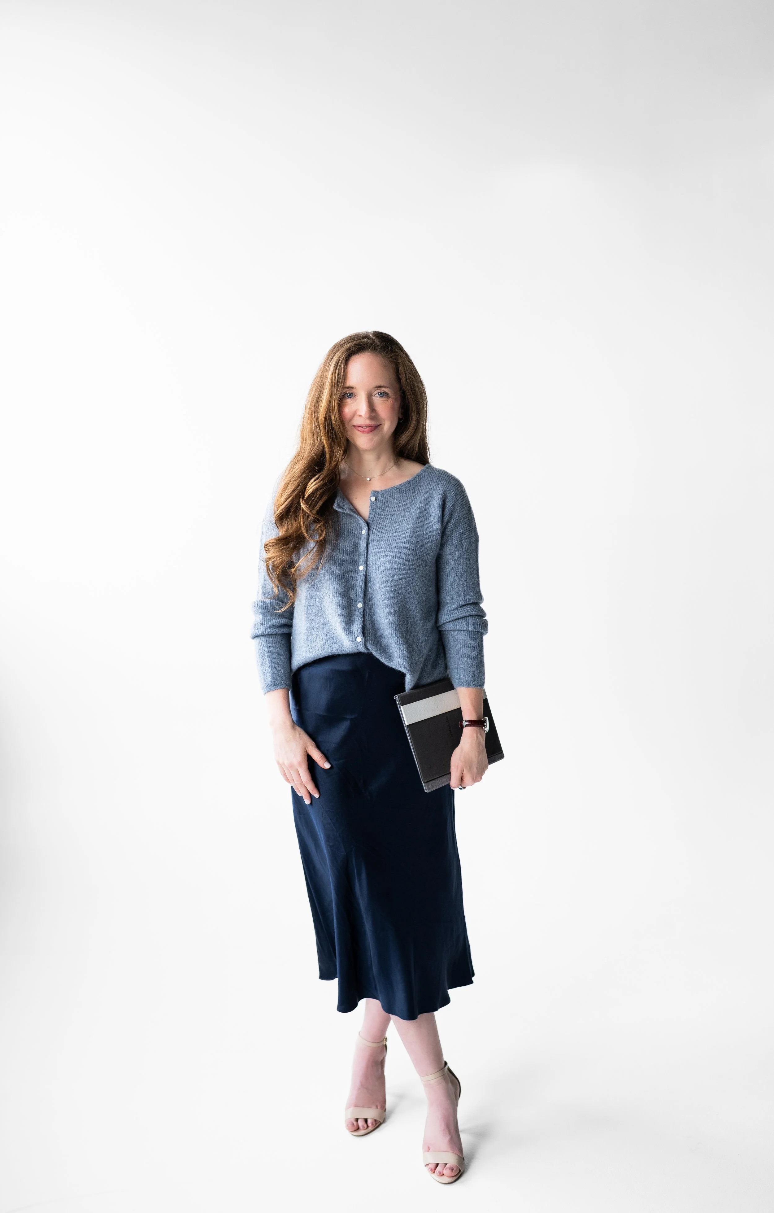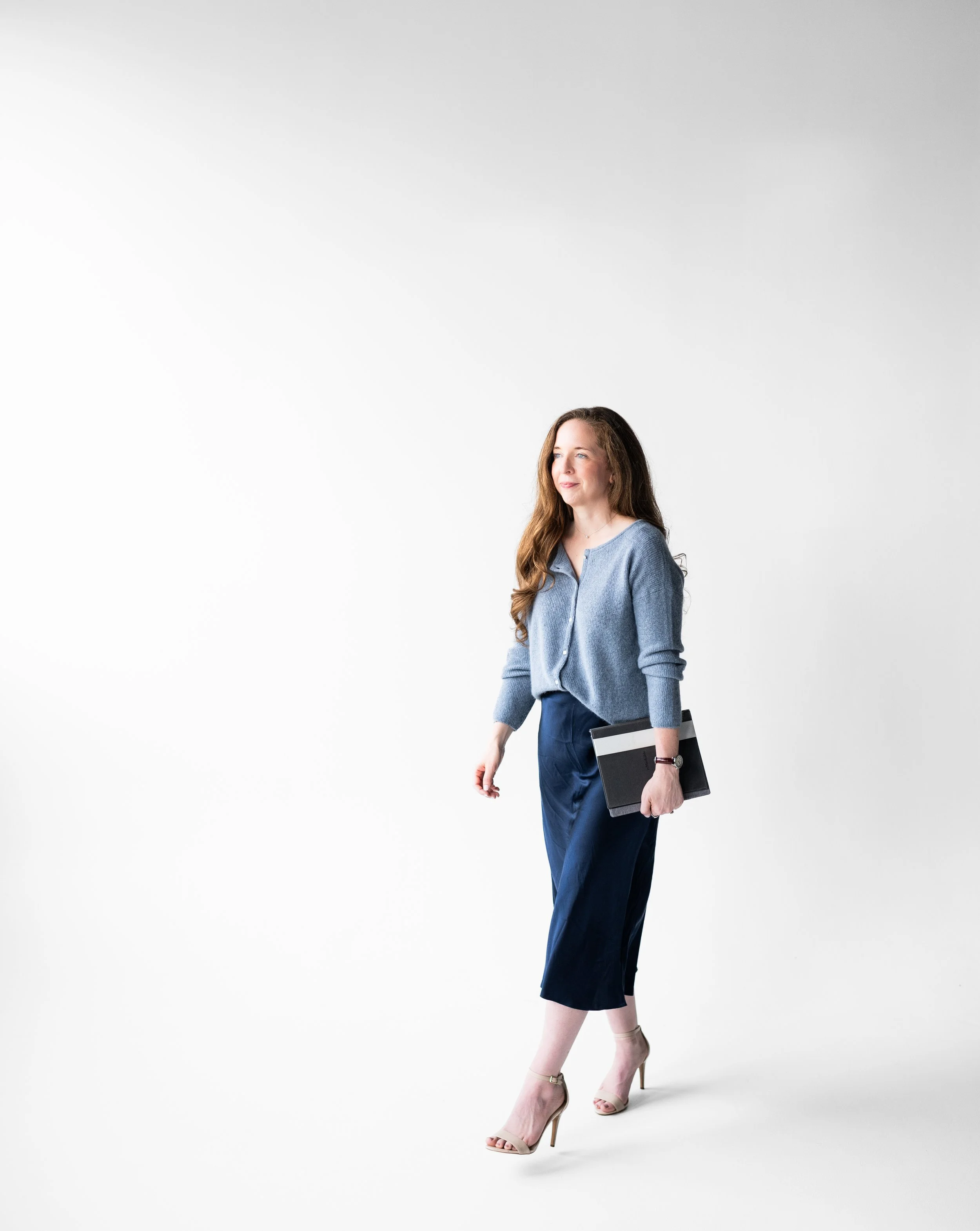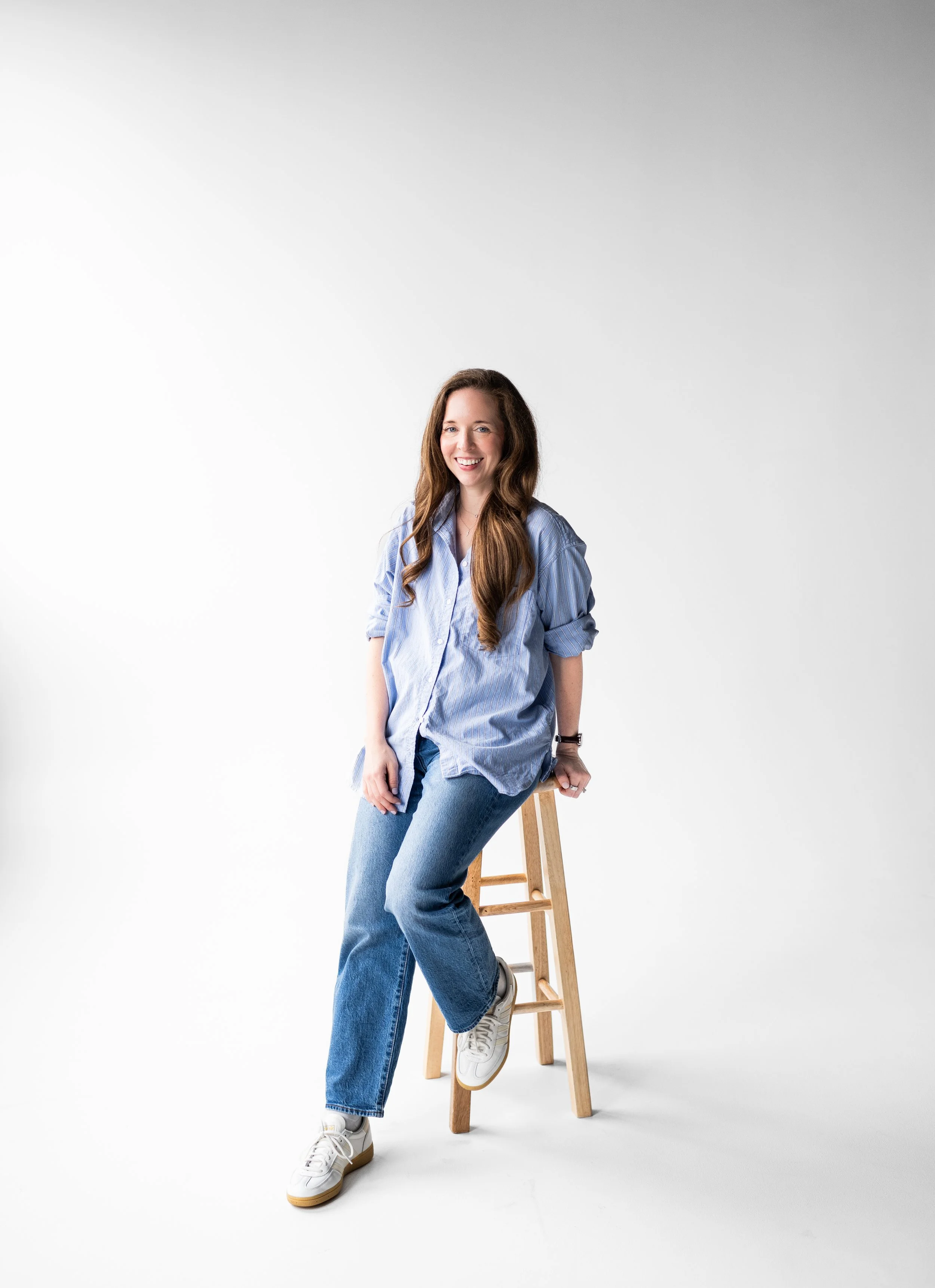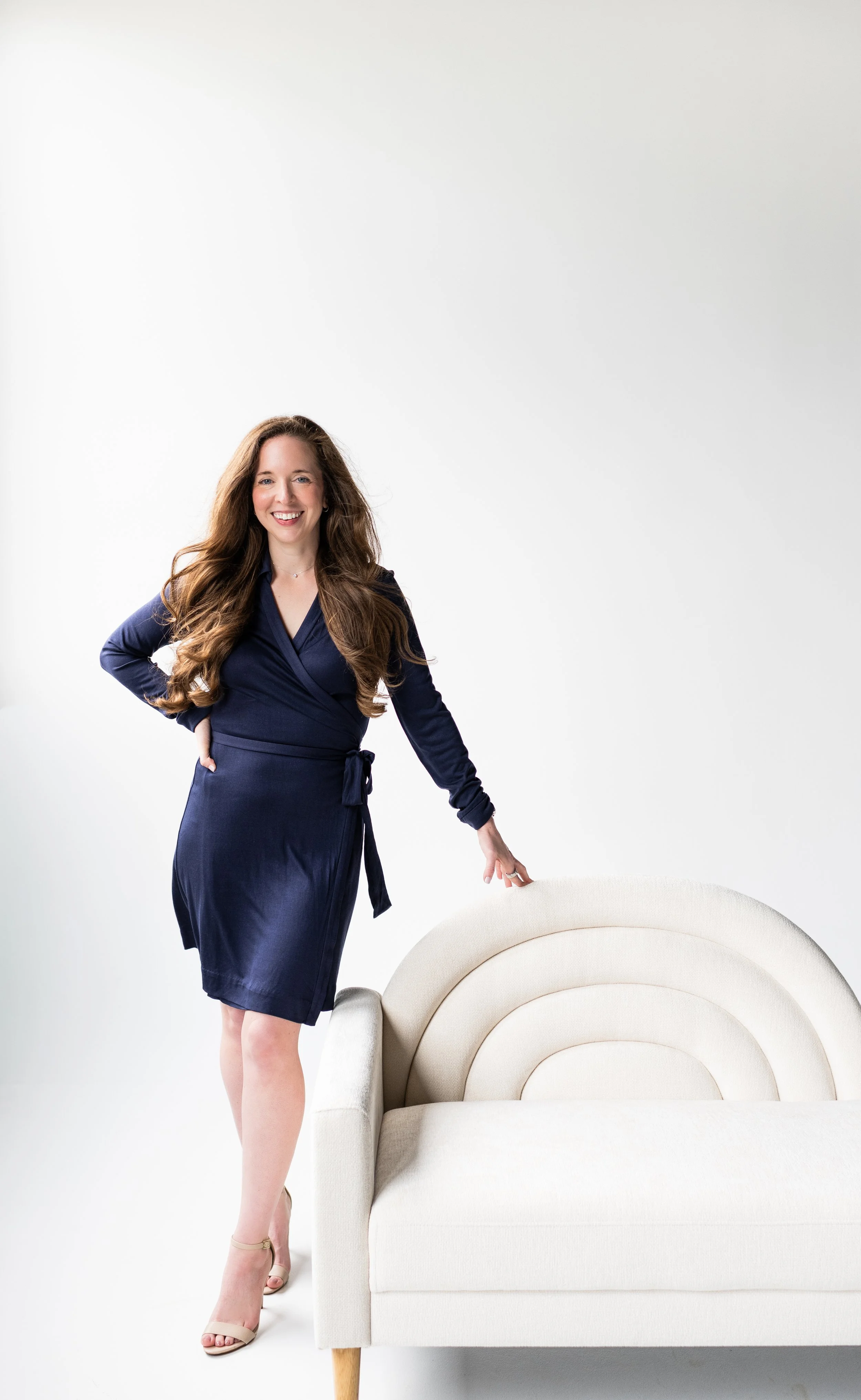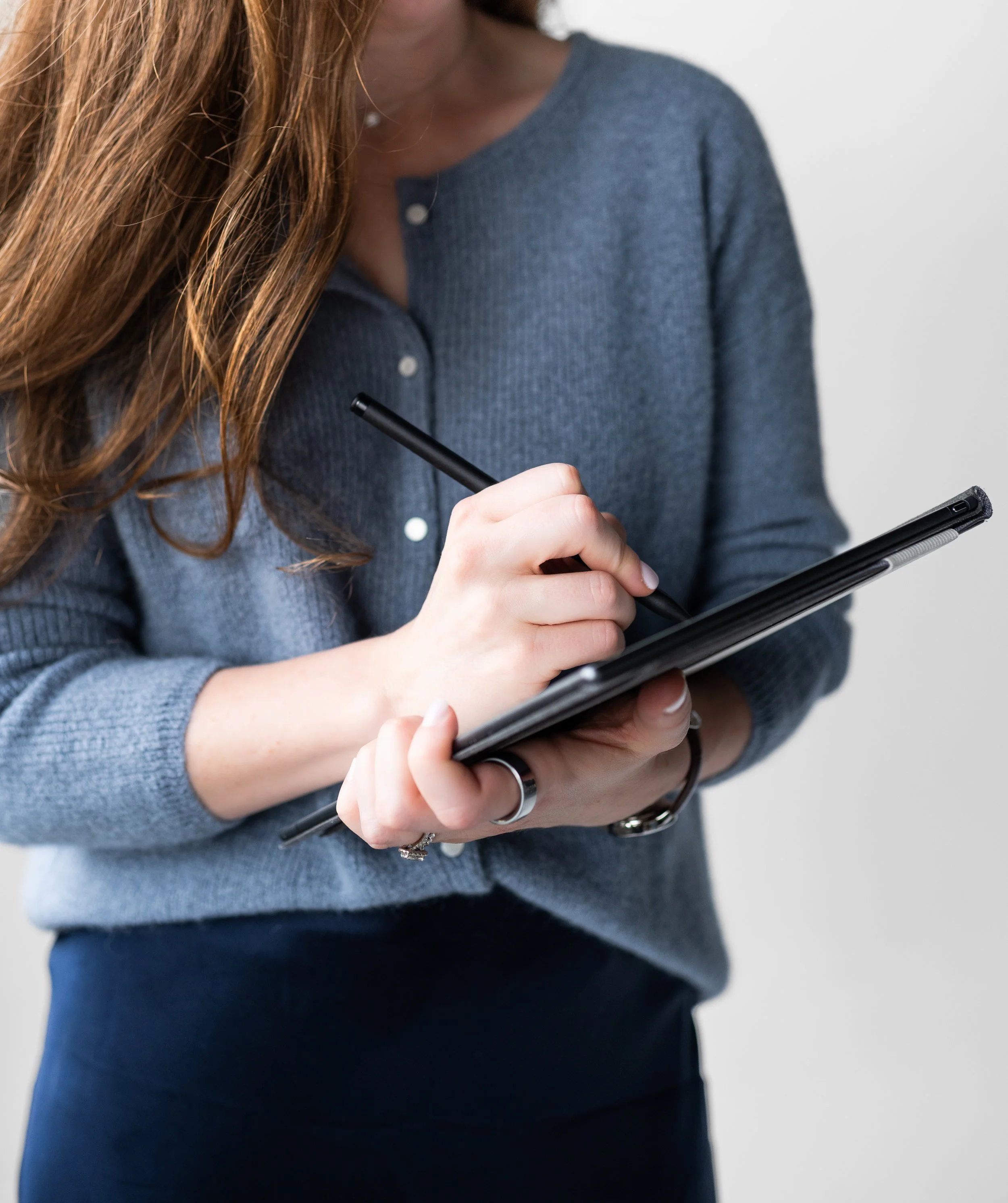 We captured brand photos with 3 outfit changes in a clean, minimal studio with a white background. We incorporated props that tell the story of her brand including laptop, notebook and iPad.